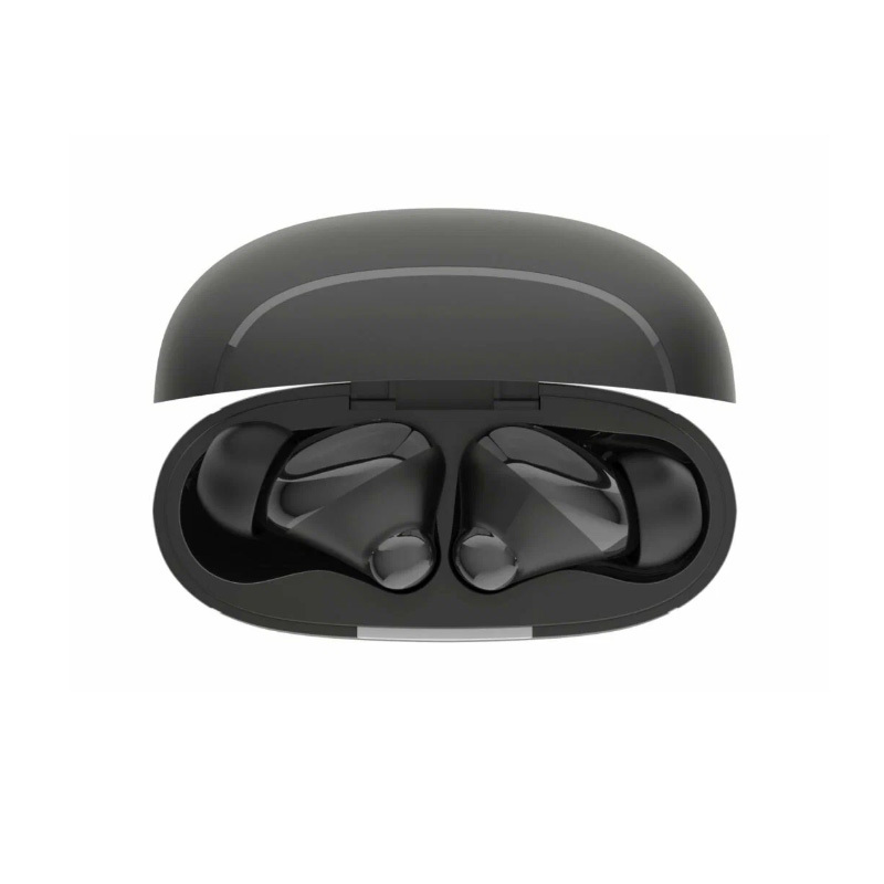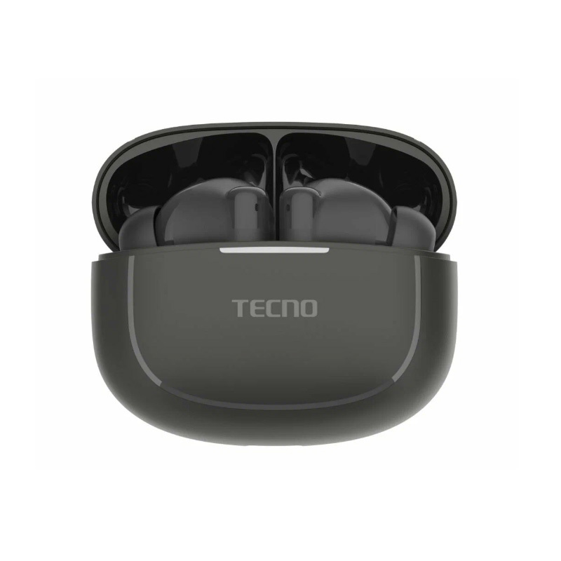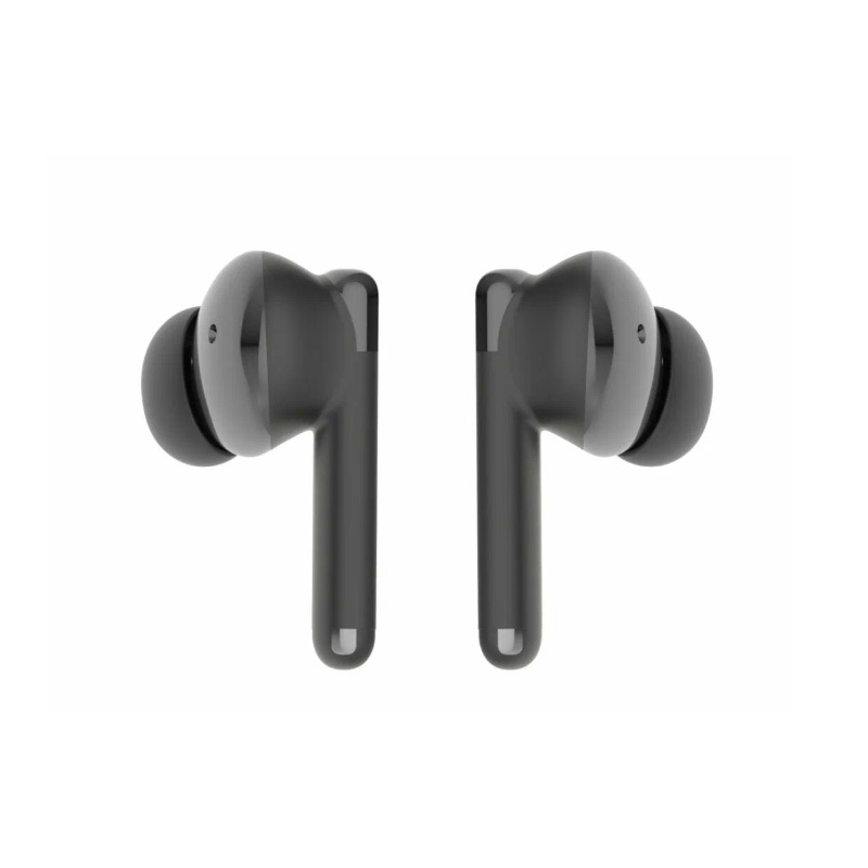 Черные пластиковые наушники TWS Tecno Buds 4 Air хорошо держатся в ушах без дополнительных креплений. Силиконовые вставки не натирают кожу при долгом ношении гарнитуры. Усиленная влагозащита IPX4 позволяет носить наушники во время занятий спортом или прогулок под дождем. В корпусе есть сенсорные кнопки для управления громкостью и доступными функциями.