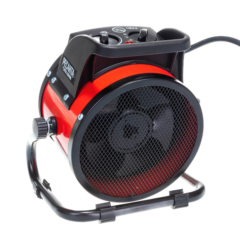 Тепловая пушка электрическая Ресанта ТЭПК-2000K представлена в ярком черно-красном дизайне. Прибор действует при потребляемой мощности 1-2 кВт. Работа осуществляется от стандартной сети 220 B, 50 Гц и 8.7 A в режиме обогрева окружающего воздуха. Термостат регулируется вручную.
